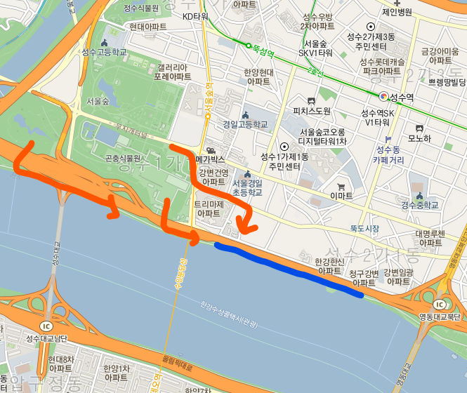 가장 왼쪽부터 1번은 서울숲 서쪽 지역, 꽃사슴들을 육교 위에서 내려다 보는 곳이 있는데 거기서 쭉 직진하면 한강 산책로로 이어집니다.